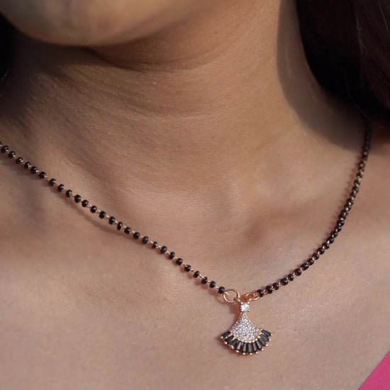 This beautifully designed mangalsutra features a stunning fan-shaped pendant — adorned with brilliant CZ stones and sleek black baguette accents, creating the perfect balance of tradition and modern charm.
